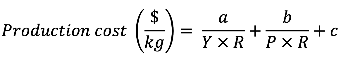 Where Y = mass yield of product from sugar, P = productivity (mass/fermenter volume/time), R = DSP mass yield, and a,b, & c are regression constants.